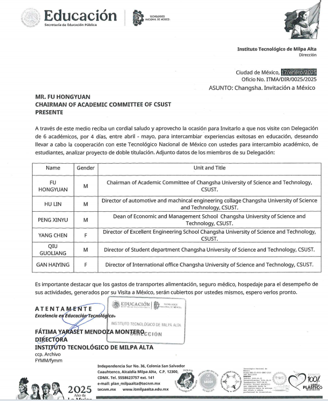 谨此,我向您致以亲切的问候,并借此机会邀请您们6位学者代表团一起于2025年4月至5月访问我校,交流成功的教育经验,为期四天,希望与墨西哥国立理工大学大学开展学术交流合作,交换学生,分析双学位项目。附上成员名单: