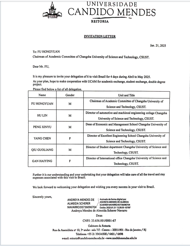 很高兴邀请贵方的 6 人代表团于 2025 年 4 月至 5 月期间访问巴西,为期 4 天。根据贵方的计划,希望与坎迪多·门德斯大学进行学术交流、交换学生、双学位项目等方面进行合作。