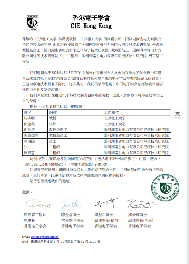 Afternoon: Participate in the establishment ceremony of the new council of the Hong Kong Institute of Electronics, attend the certificate ceremony for "Honorary Members", and participate in international forums and seminars organized by the Hong Kong Institute of Electronics, with the theme of creating international technical standards |